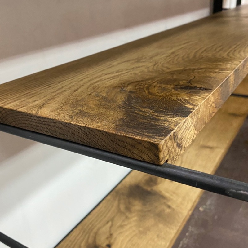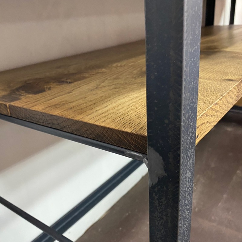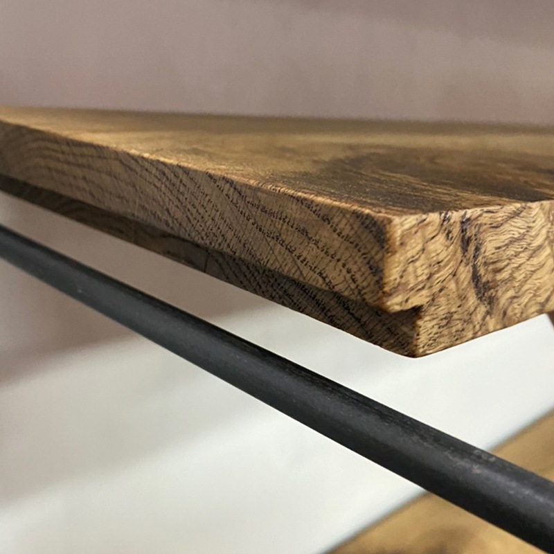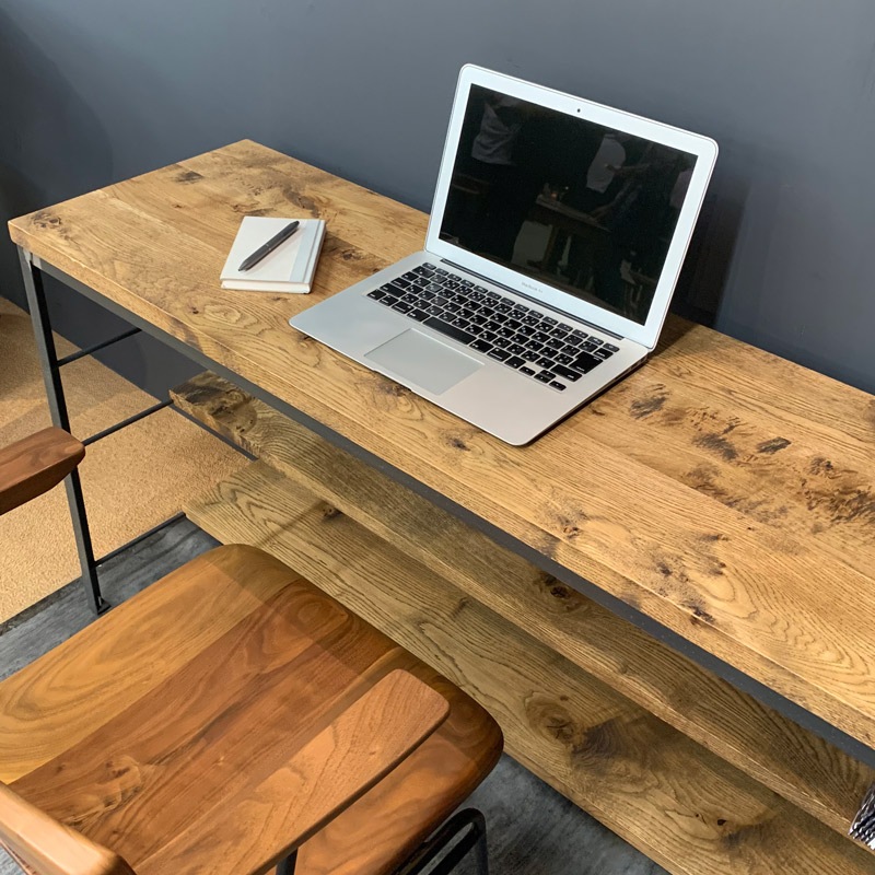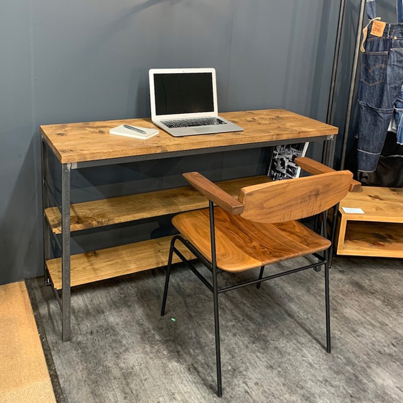 天板と棚板には讃岐産コナラの無垢材、フレームにはアイアンを使用しています。コナラ材は木本来の節や割れを素材の表情として生かした無骨な仕上がり。ヴィンテージブラウンカラーのオイルを塗り込み、その表情をさらに際立たせています。