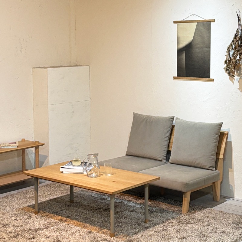 明るい木目のオーク天板に、まろやかなベージュ脚を組み合わせた、優しい印象のコタツ。脚元の継脚には讃岐産コナラを組み合わせ、全体をアーストーンで統一。さりげないニュアンスカラーが、リビングに穏やかな雰囲気をもたらします。